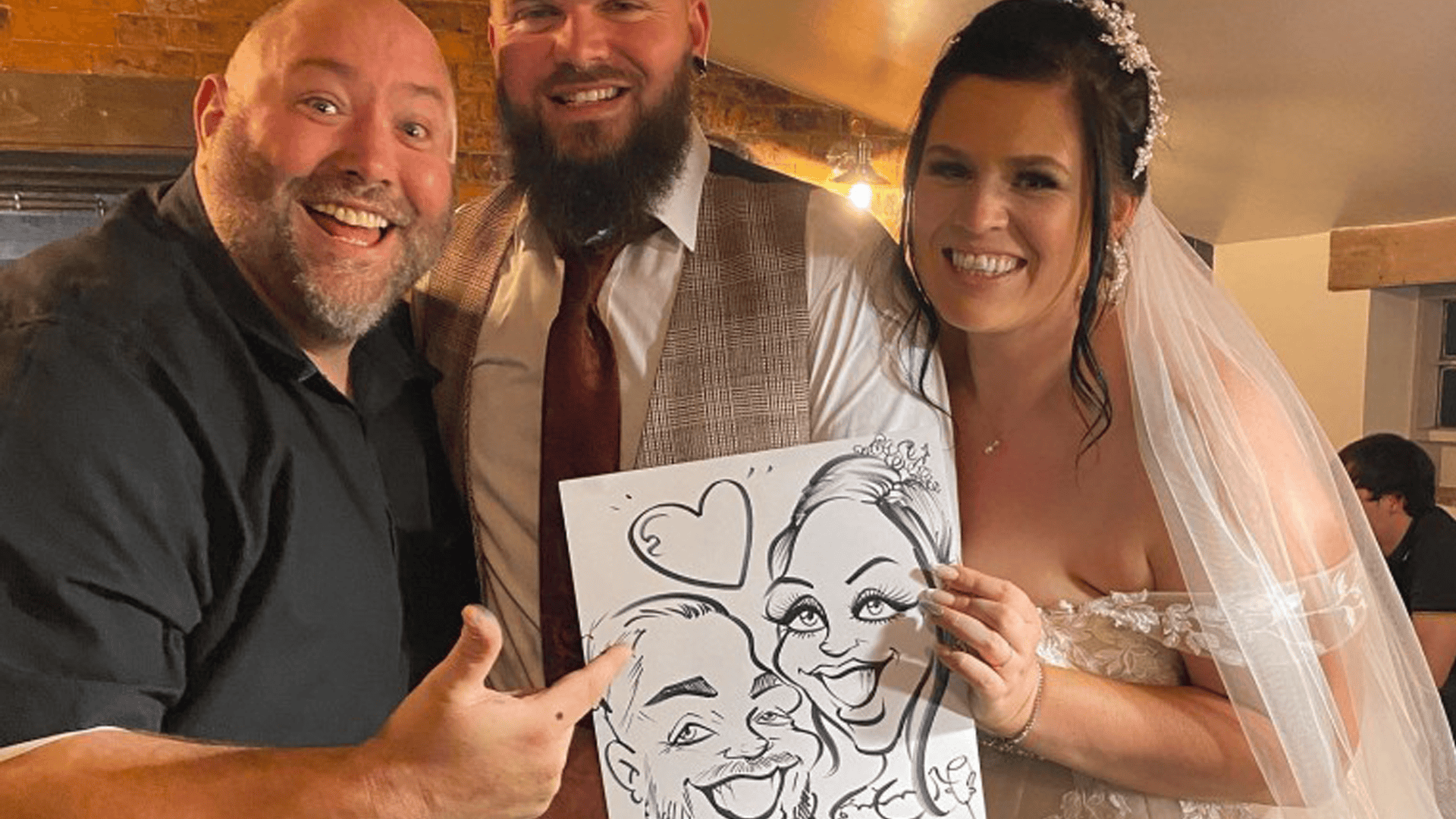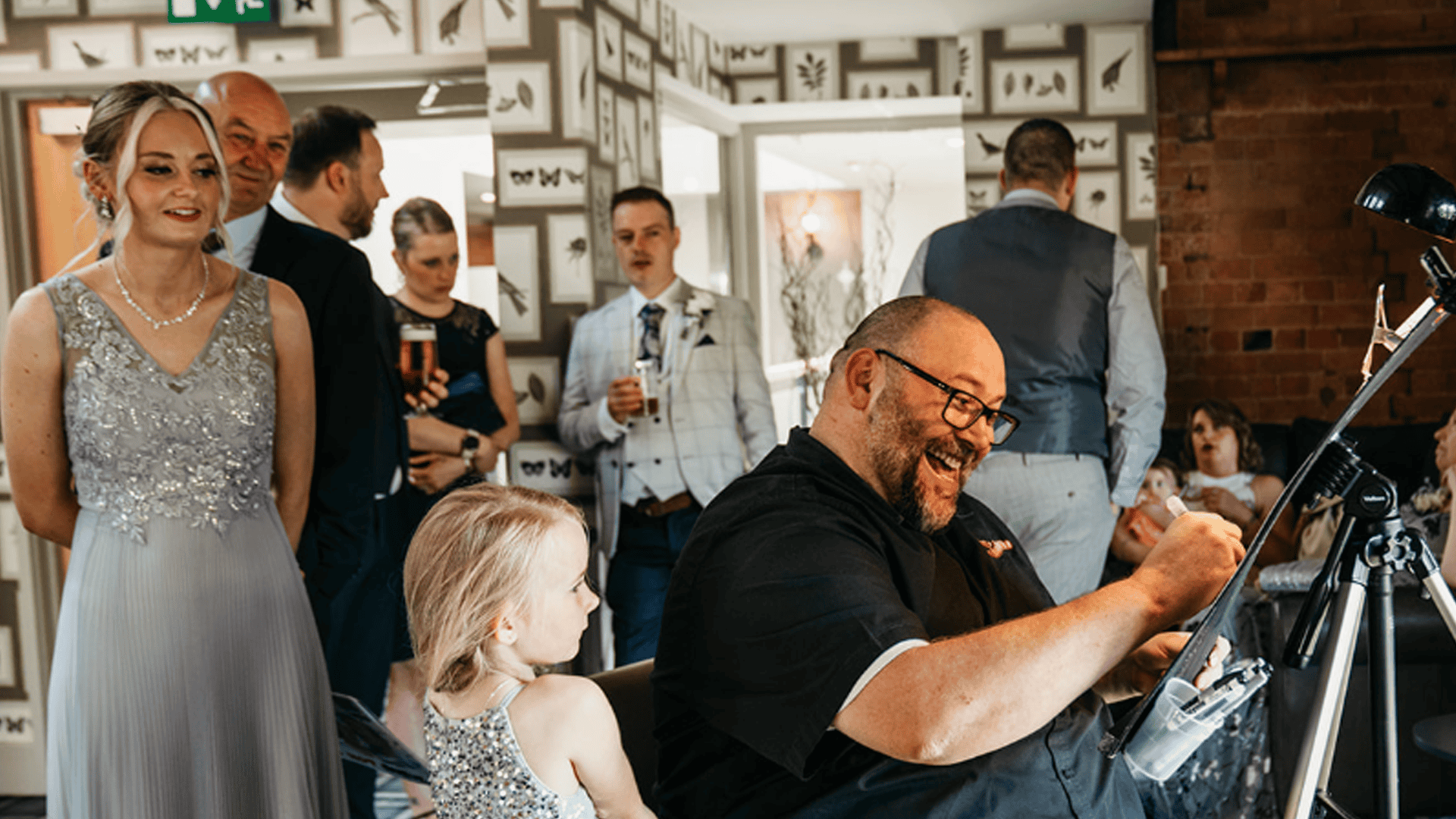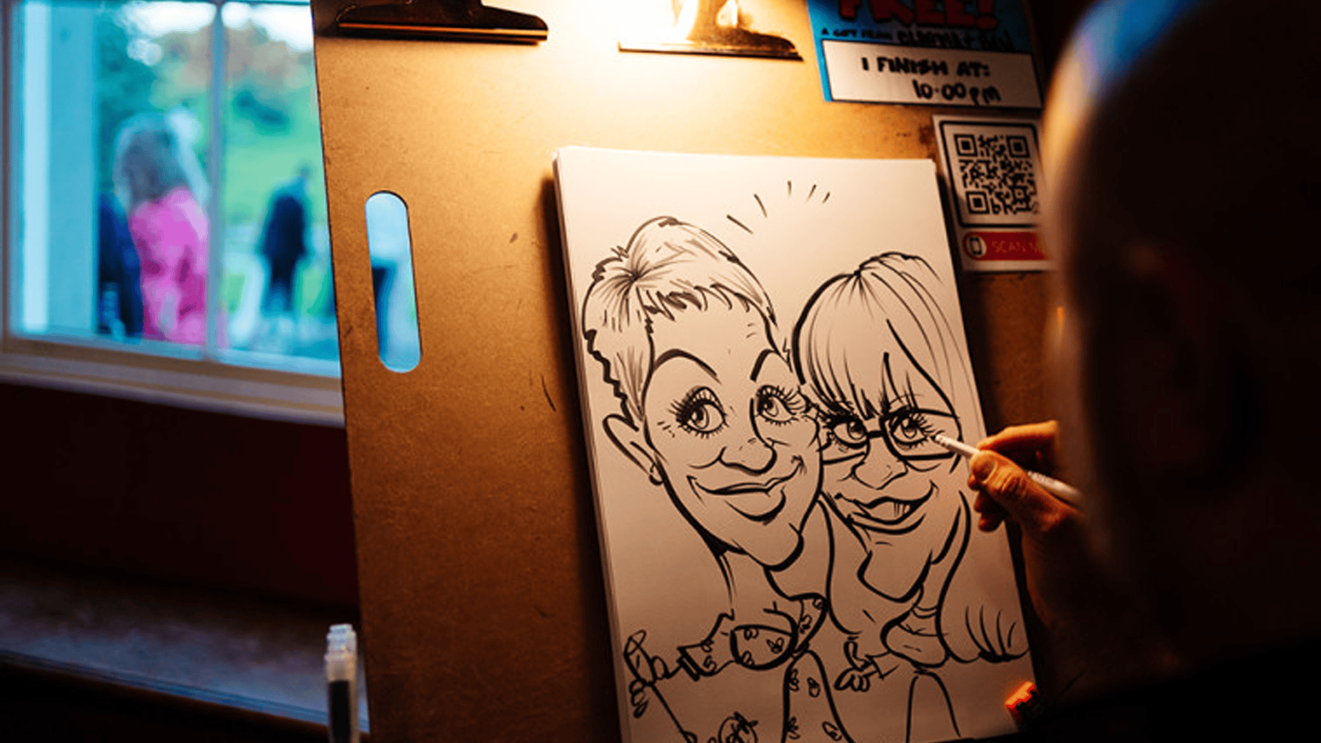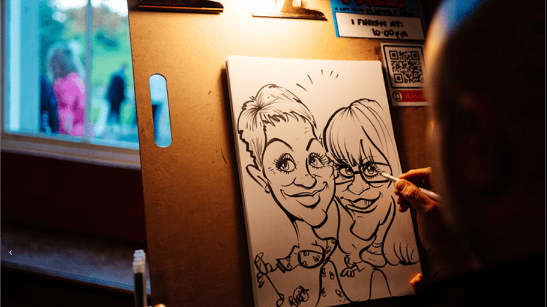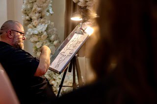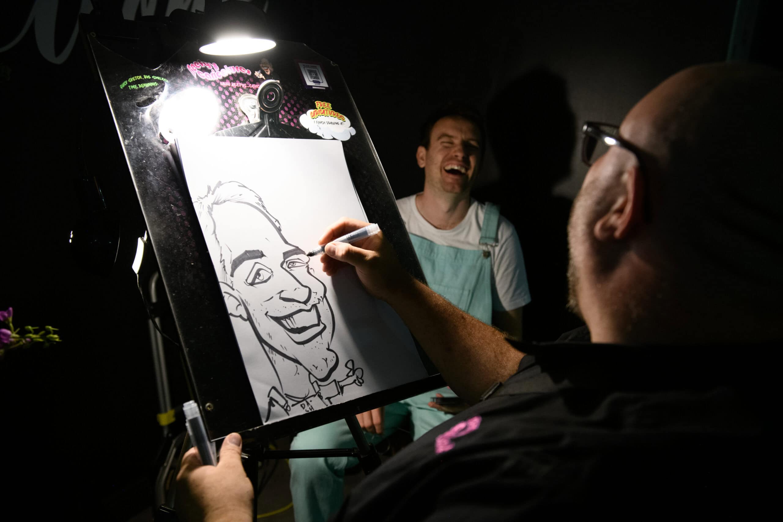 I keep things friendly, relaxed and fast so no one is hanging about. Some guests want a quick sketch, others enjoy watching over my shoulder and a few always come back later with a mate because they want to see their reaction. It creates a steady stream of laughter and a bit of harmless chaos that lifts the whole night.