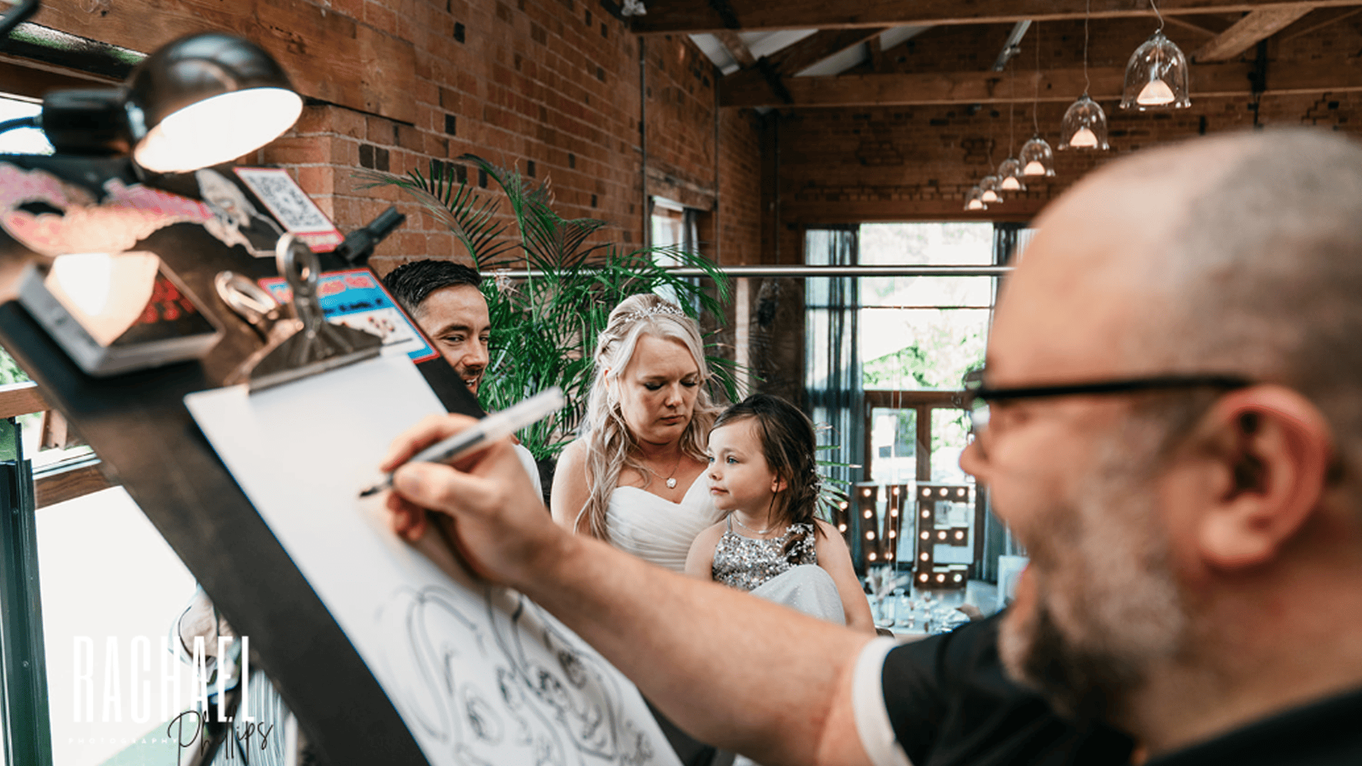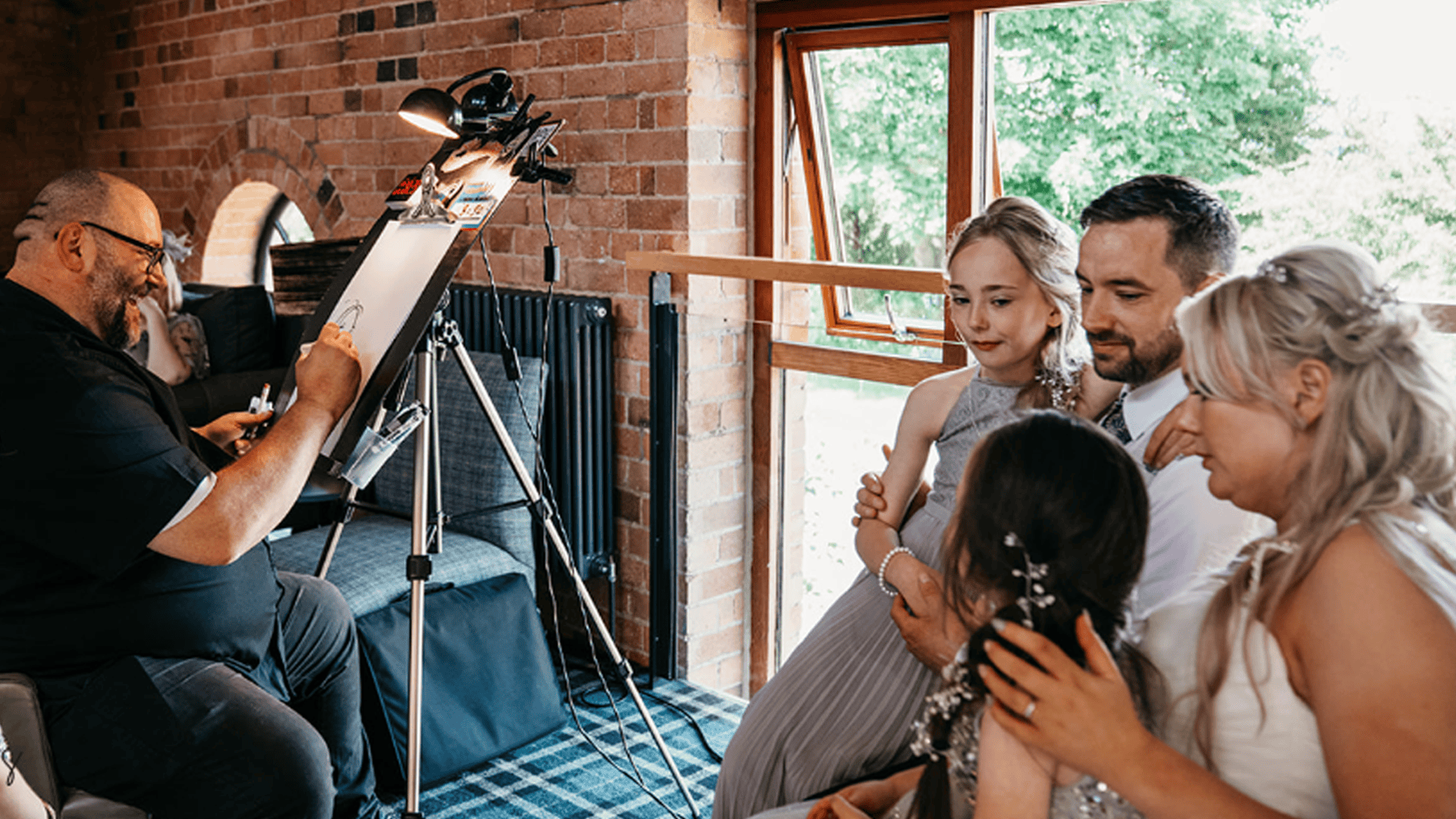 I cover Nottingham, Derby, Leicester and the wider East Midlands and draw at weddings, parties and corporate events of all sizes. You get a professional setup, quick drawings and a relaxed style that works for any crowd.